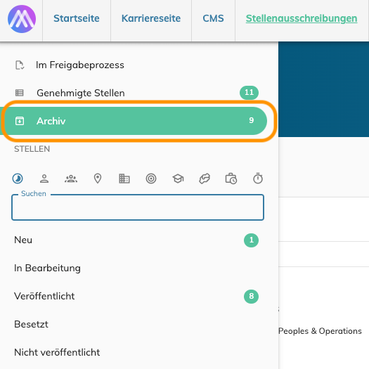 Ja, es gibt ein Archiv. Du findest es, indem du im Menü der Stellenausschreibungen auf „Archiv“ klickst. Eine archivierte Stelle kannst du wiederherstellen, indem du rechts auf „Aktionen“ klickst und die Option „Stelle wiederherstellen“ auswählst.