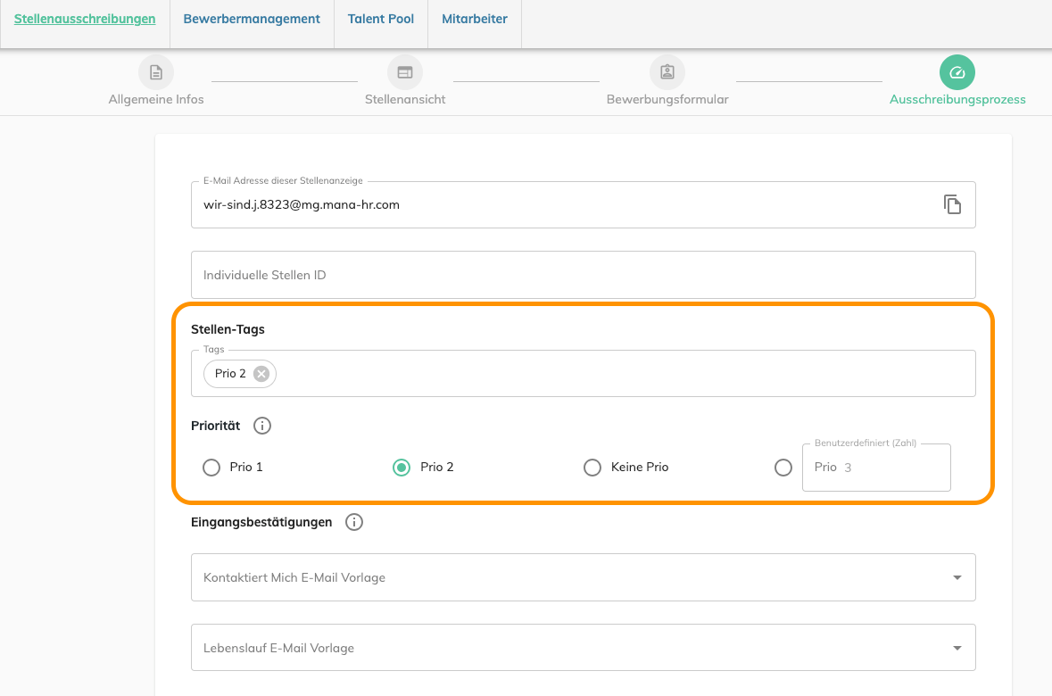 Im Schritt "Ausschreibungsprozess" kannst du für deine Stelle ein Tag vergeben, wie z.B. “#Prio 1” und so deine Stellen beliebig in deine gewünschte Reihenfolge bringen.