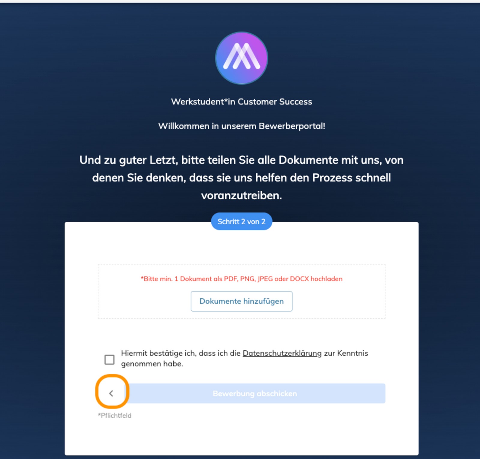 Im Bewerbungsformular ist ein Pfeil, der auf die erste Seite des Formulars zurück führt.