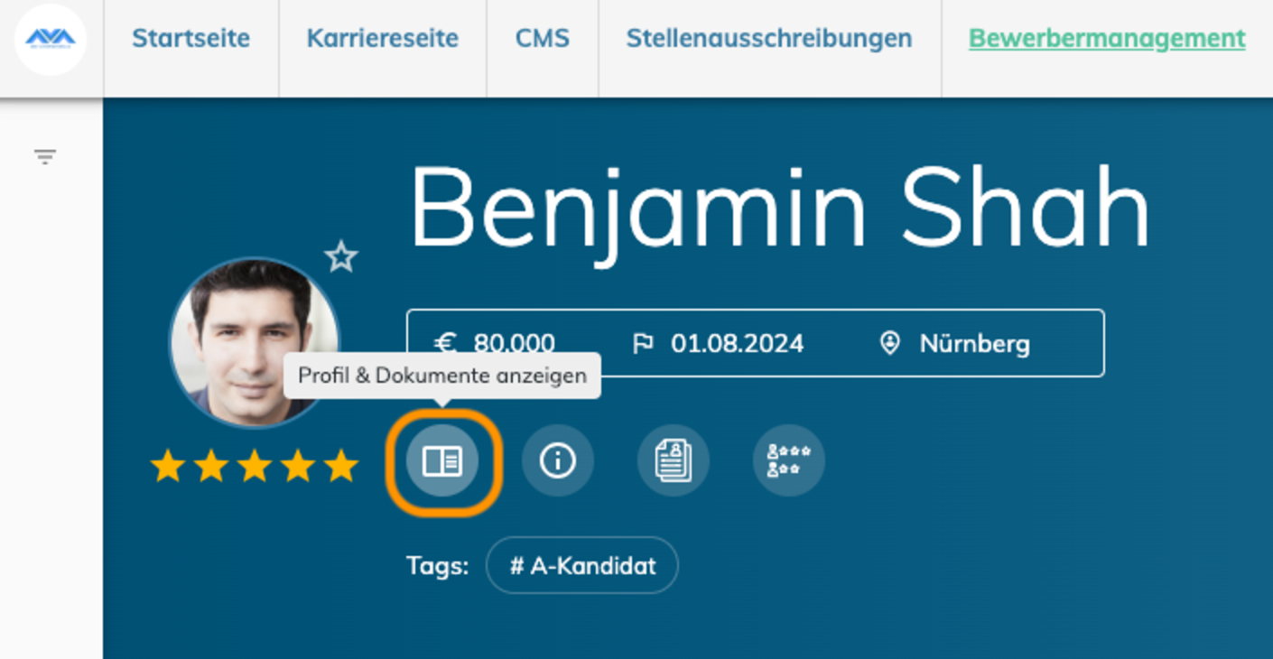 Klicke in der Bewerberansicht auf den Button „Profil und Dokumente anzeigen“. Jetzt öffnet sich das Profil und auf der rechten Seite siehst du die Dokumente, wie z.B. Lebenslauf oder Zeugnisse. Oben rechts auf dieser Seite findest du das Feld „Dokumente hinzufügen“.